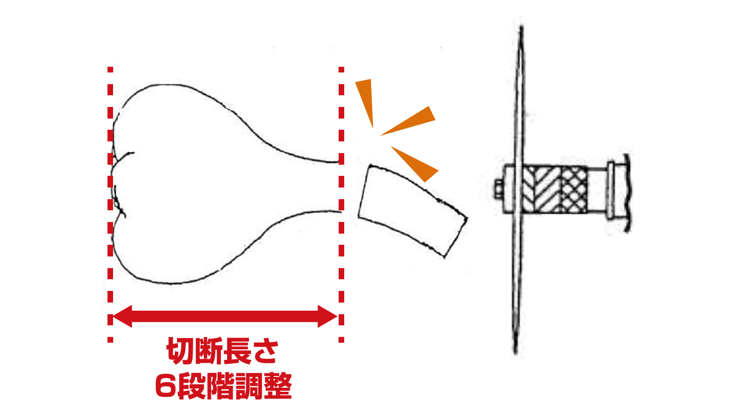 切れ味、耐久性共に抜群の特殊形状薄型根切カッターを採用、ヒゲ根をスパッと根元から切断します。大径の茎切カッターは茎の切断長さも調節できます。