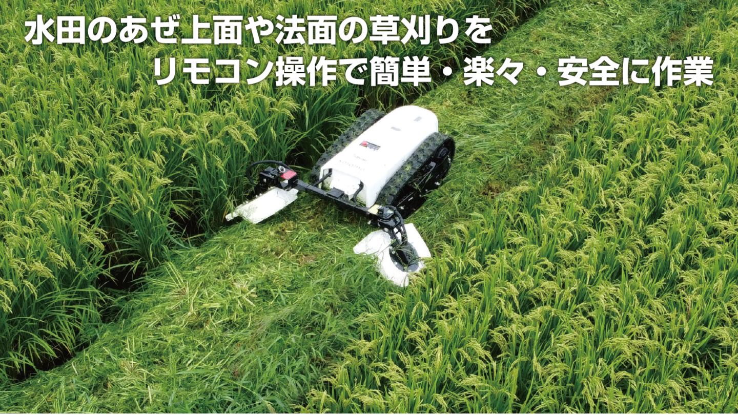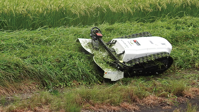 草刈機を肩がけしたり、中腰の姿勢で作業する事なく、リモコン操作で作業中の振動も無く、楽に作業が行えます。
