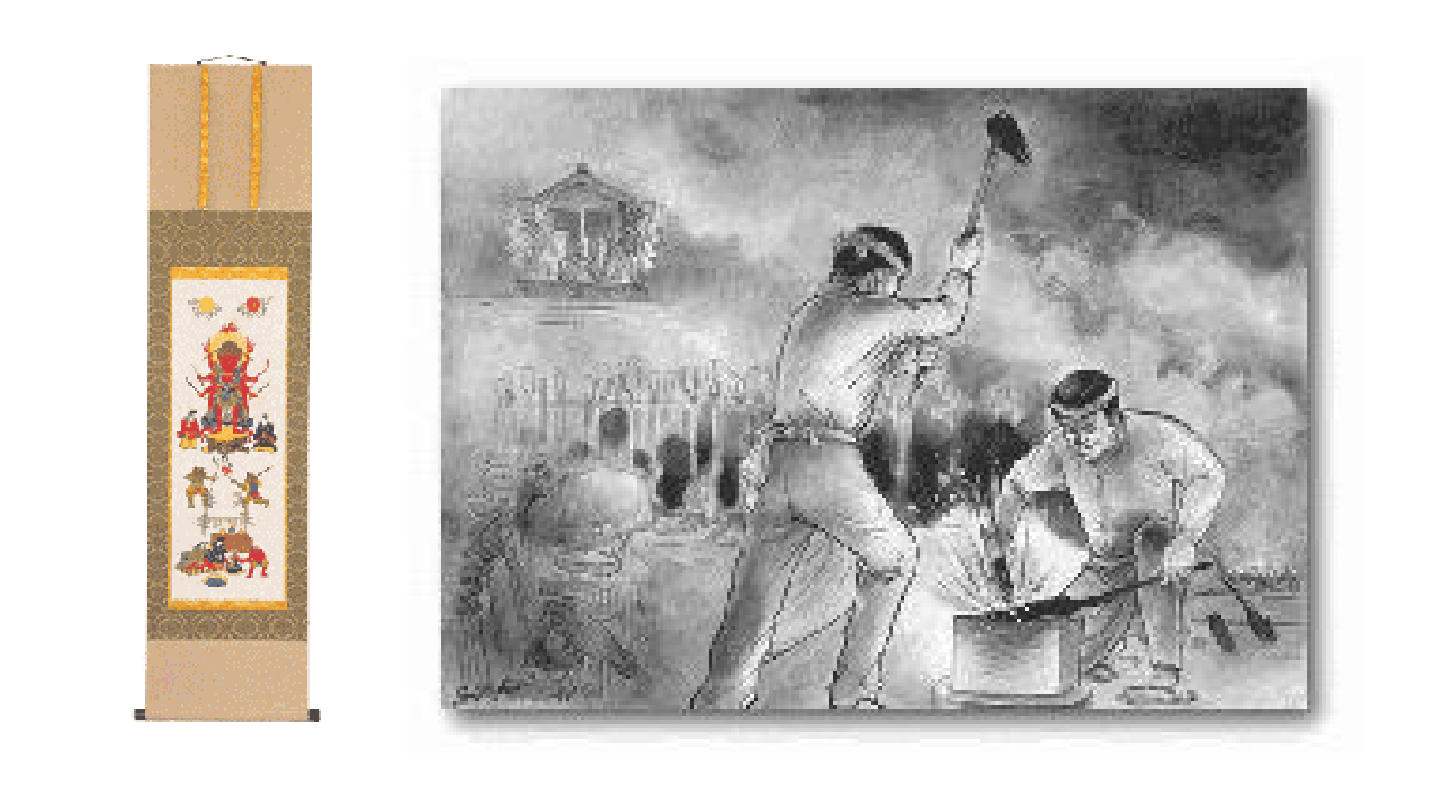 The founder Chuujiroo Sasaki was presented with a piece of hanging scroll and authorized smith name " Ittesu"as a completion certificate of swordsmith apprenticeship by his master Mr. Toyokuni Miyamoto.