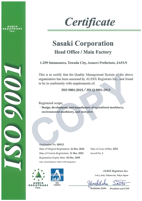 ISO9001: 2015. We construct the quality management system which is suitable for requirement and address laws and ordinances, regulatory requirements and customer requirements. Through following items, we continuously improve the effectiveness of quality management system and performance of work process.